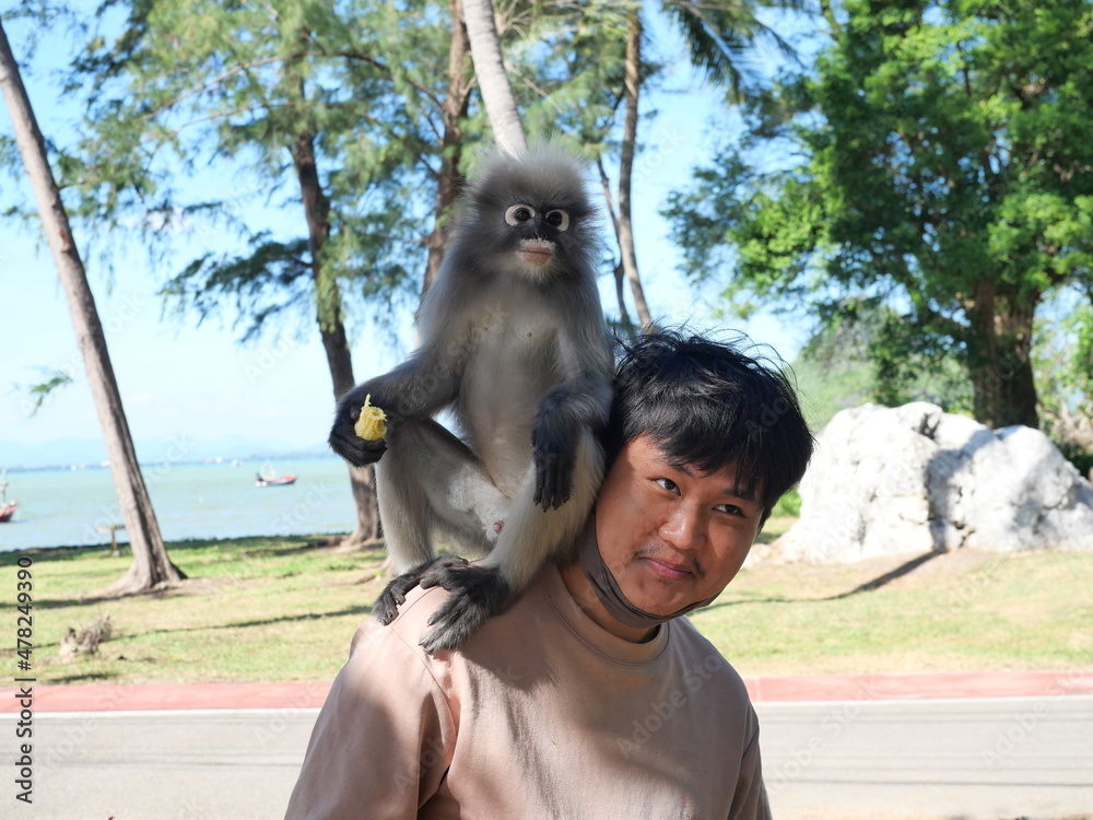 Dusky leaf monkey ( Spectacled langur ) sitting on the shoulder of an asian man on the beach wiith sea in backgroiund at Prachuap bay, Prachuap Khiri Khan Province, Thailand