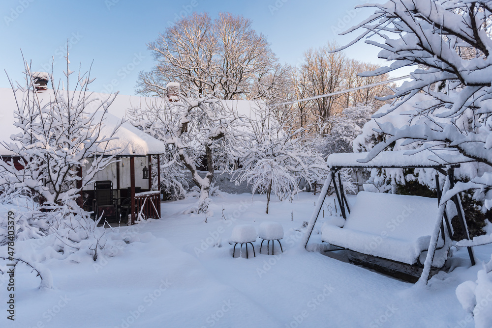 Garden with a thick layer of snow on a sunny winter day