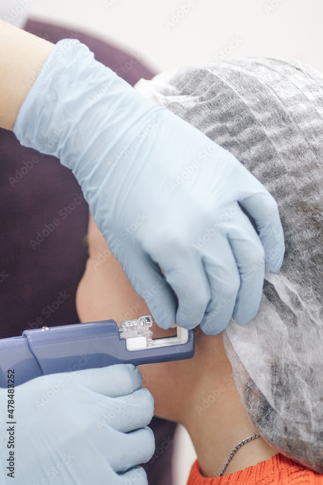 Close-up of nurse hands in disposable medical gloves pierce the ear with gun for piercing ears of child. Process of piercing ears of little girl