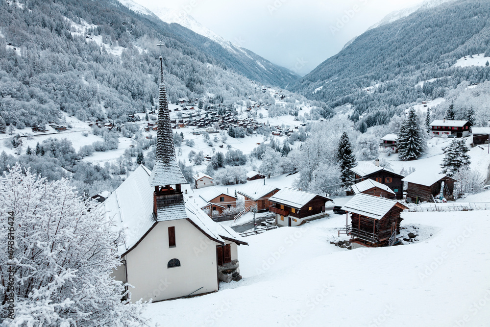 Église dans une vallée enneigée