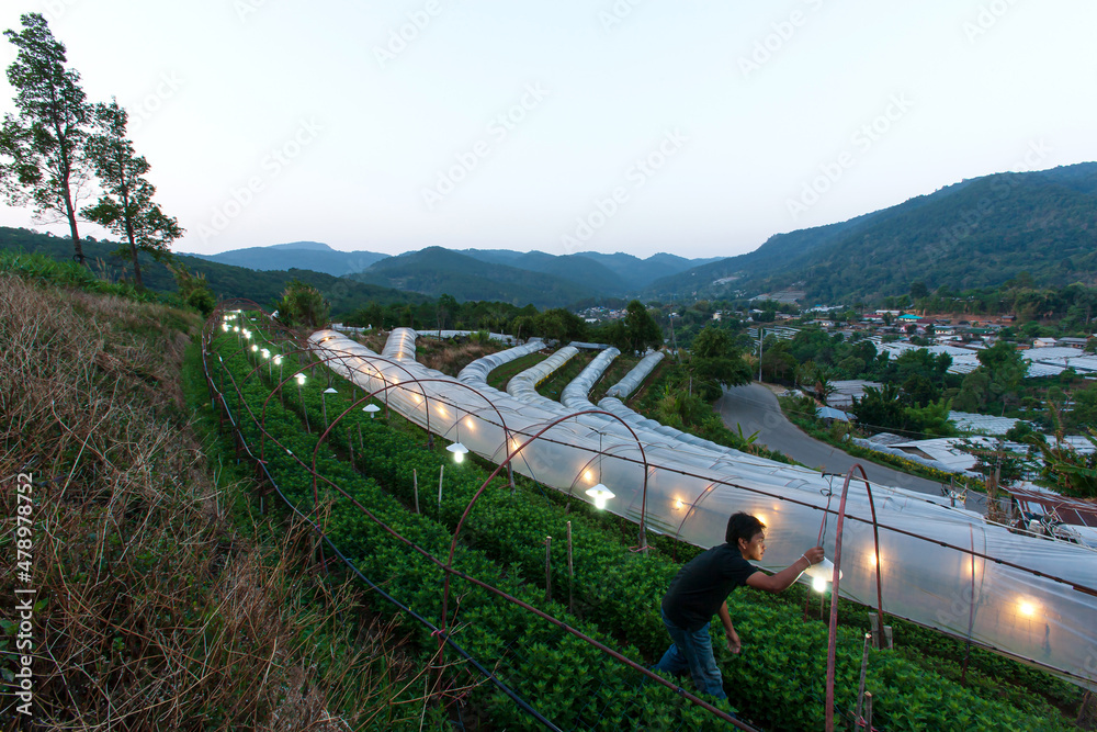 Gardener turns on the lights in flowers and vegetable greenhouse.