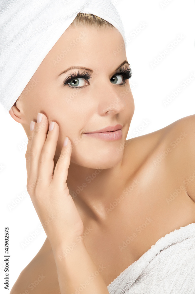 junge hübsche frau bei körperpflege mit weissen handtuch