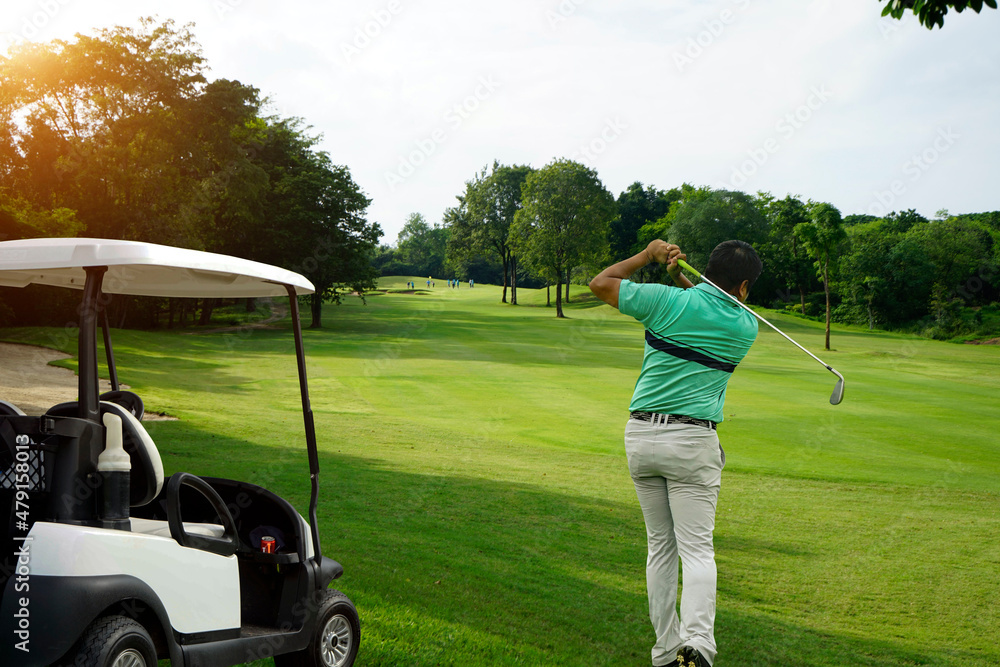 Golfer playing golf beside the golfcar in beautiful golf course in the evening golf course with sunshine in thailand