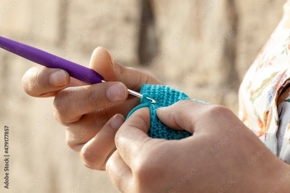 woman in the street knitting crochet