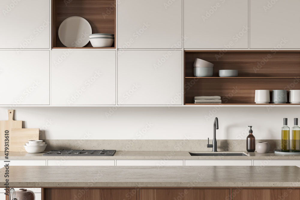 Light kitchen set interior with shelves and sink with stove, kitchenware