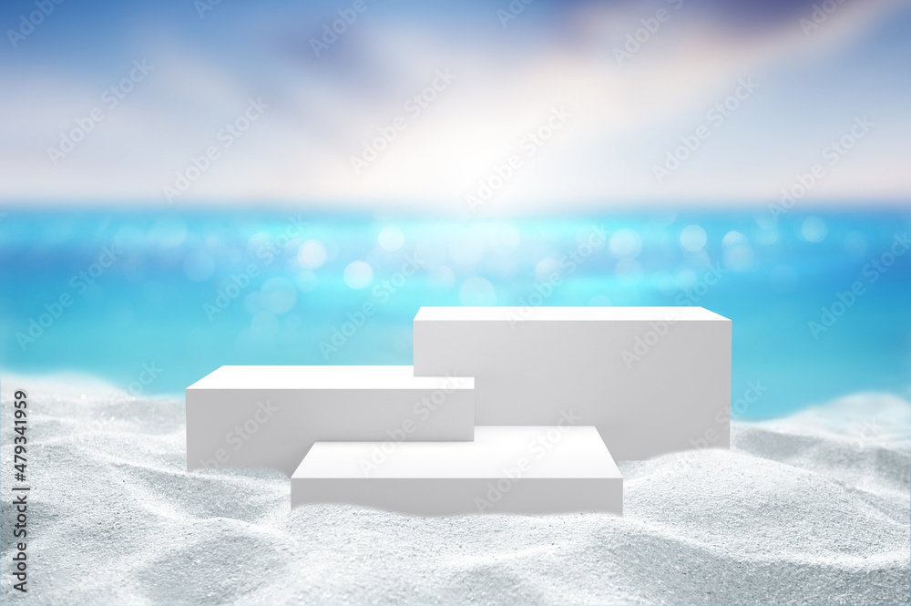White Sand with White 3D podium put on sand dune againt blurry blue ocean and beautiful sky Summer background with display advertistment concept, 3D rendering