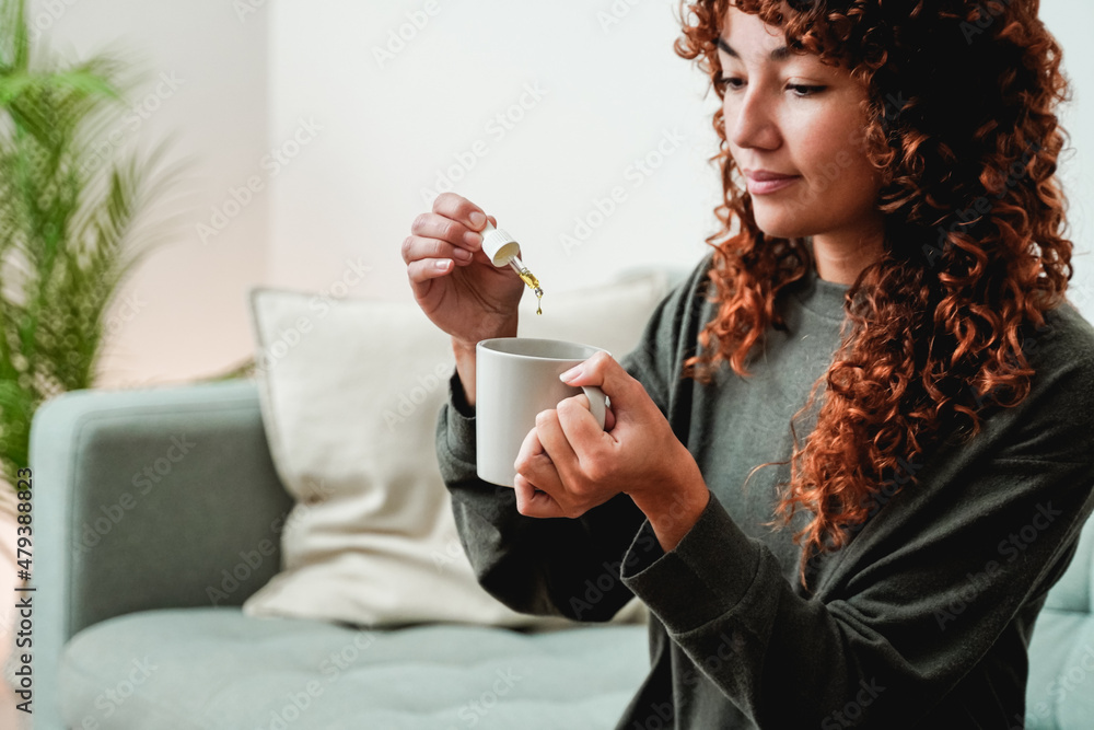 Cbd oil dropper - Young woman taking cannabis oil in tea drink for anxiety and stress treatment - Alternative medicine