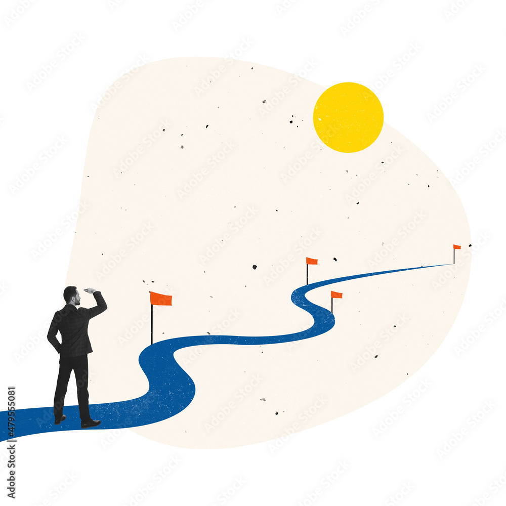 Modern design. Contemporary art collage. Businessman standing at the beggining of road and looking in telescope