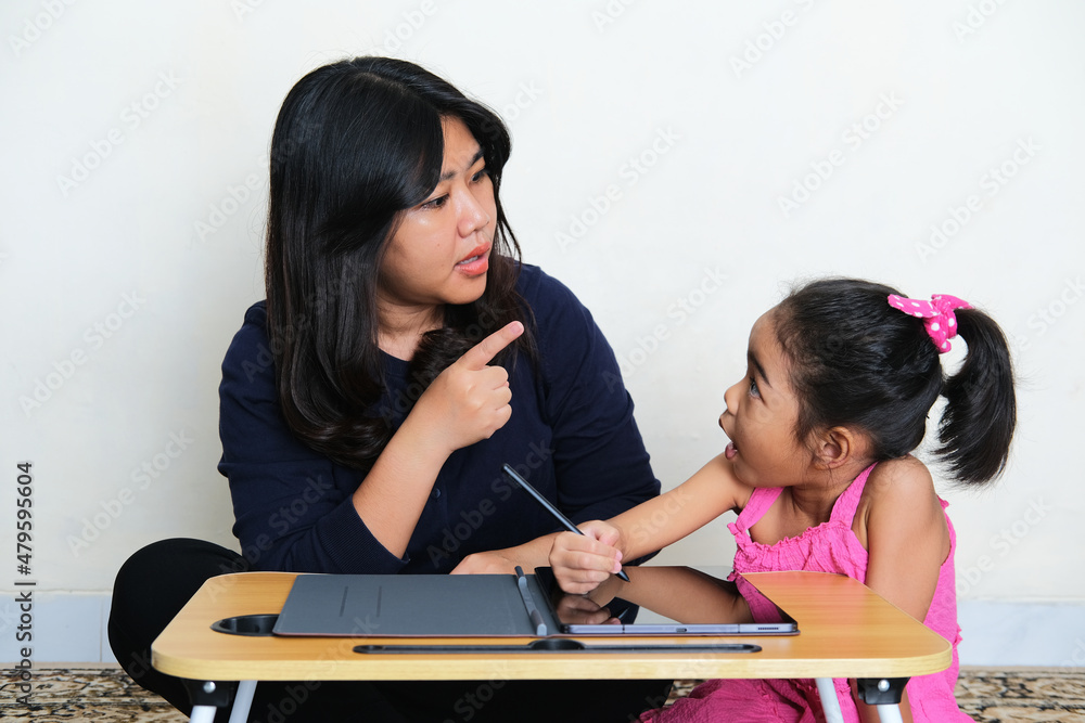 A mother angry to her daughter when study using mobile tablet gadget