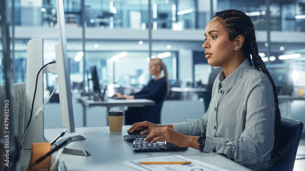 Corporate Office: Black Female IT Technician Using Desktop Computer, Uses Big Data Statistics, Graphs. Smiling Creative Software Engineer Work on eCommerce Project Marketing, Development.