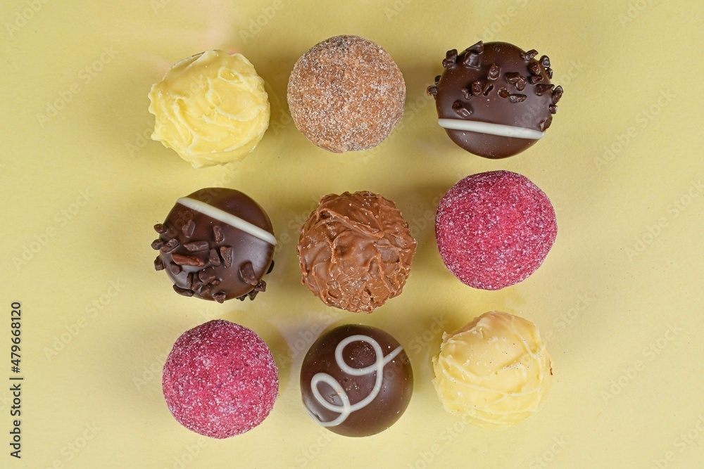 Chocolate pralines top view stock images. Chocolate candies on a pastel beige background. Chocolate frame top view. Square-shaped chocolate pralines background