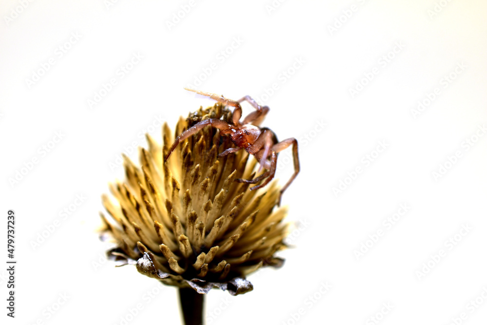 A shot of the tegenaria spider sitting on a dry flower from above