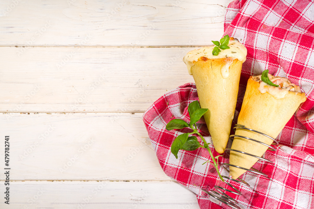 Trendy Cone pizza, modern pizza recipe, with tomatoes, basil, mozzarella cheese, baked pizza cones dough, ham and mushrooms