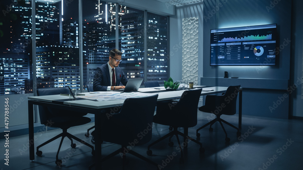 Successful Handsome Businessman Working on Laptop Computer in Big City Office Late in the Evening. Finance Investment Analyst Checking Line and Pie Graphs from Project Management Report.