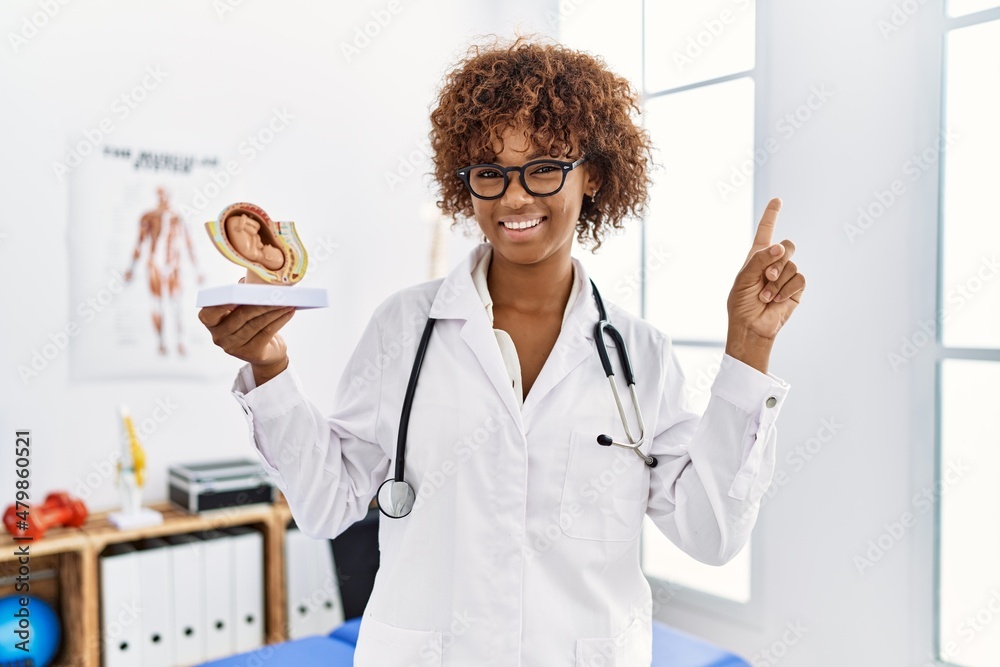 Young african american doctor woman holding anatomical model of female uterus with fetus smiling happy pointing with hand and finger to the side