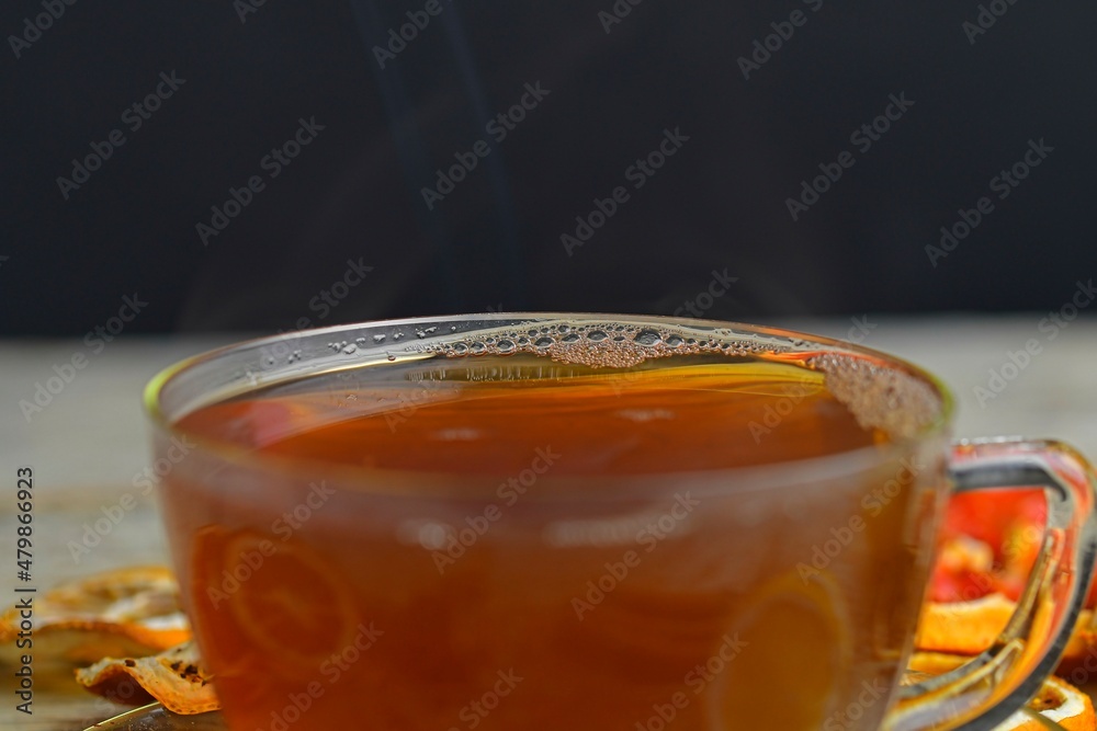 Cup with hot tea and steam on black. Glass cup of black tea with cinnamon sticks, anise star, lemon and dried fruit on white wooden table background. Macro image