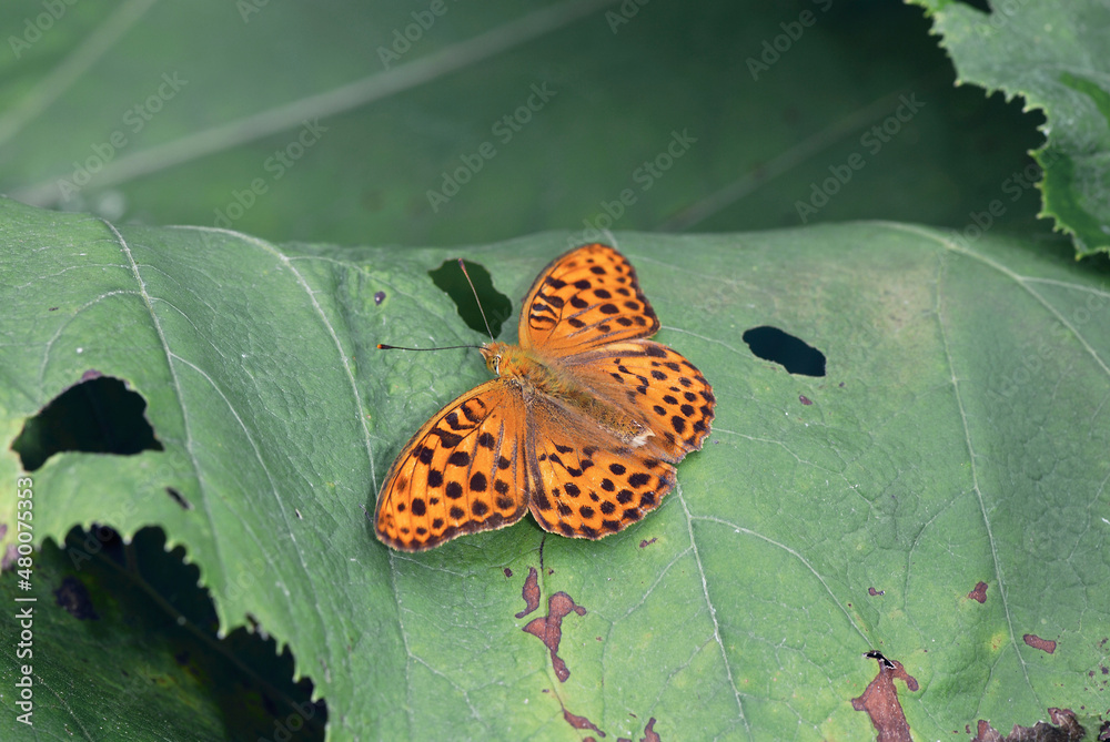 翅を開いたオオウラギンスジヒョウモンの雄(北海道・鶴居村)