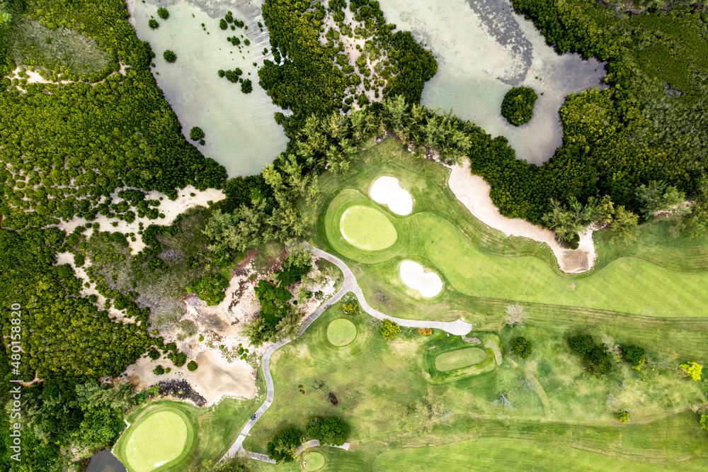 Aerial view, bay at Grand Port, il aux Cerfs with golf course, Flacq, Mauritius, Africa