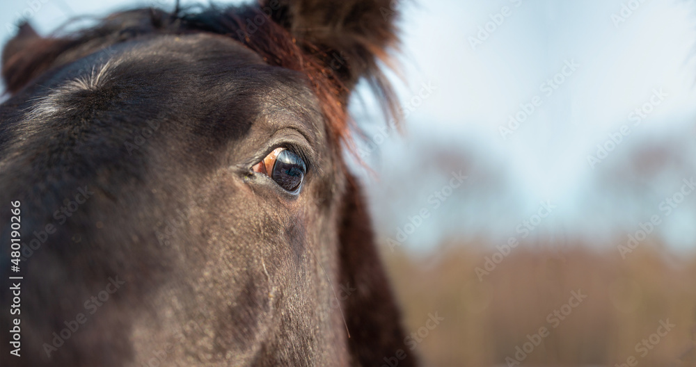 Horse banner background. Eye, horse's head close up. Palomino