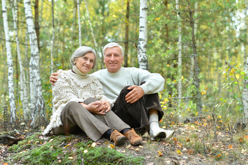 Portrait of happy senior couple sitting on lawn in autumn birch forest