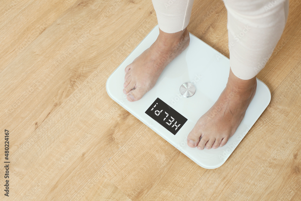 Feet of a woman stepping on a scale indoors, room for text. overweight problem