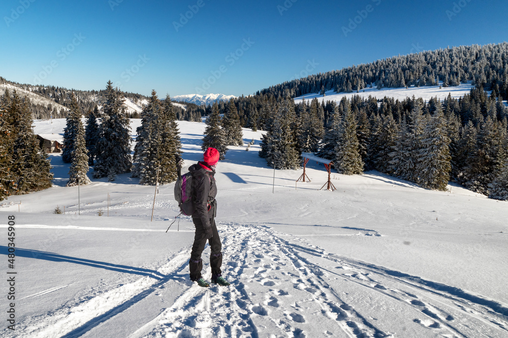 Woman hiker walking on snow in winter country
