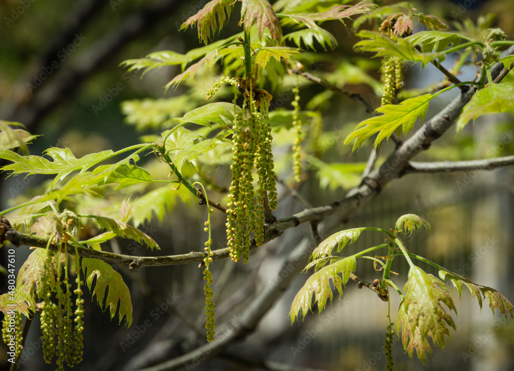 Spring blooming of Quercus palustris, the pin oak or swamp Spanish oak. Young foliage with catkins (earrings) on green bokeh. Sunny day. Nature concept for natural design.