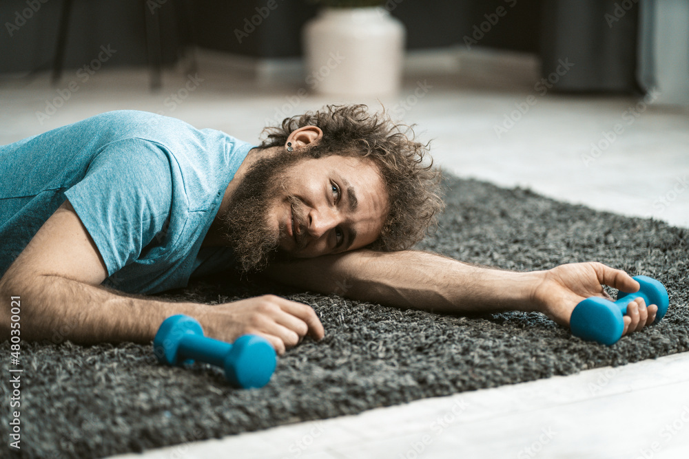 Sly Lazy Guy Lies on the Floor with Small Dumbbells in his Hands, Pretending to be Tired. Sport at Home. Copy Space. Close-up