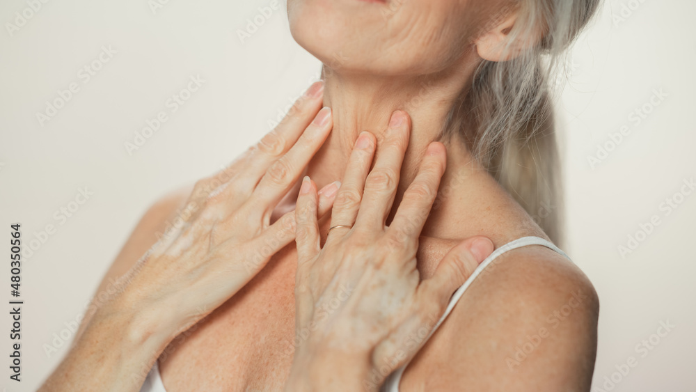 Anonymous Senior Woman Touching Her Neck, Chest, with Hands, Enjoying Soft Skin. Elderly Female Natural Beauty. Dignity and Grace in Old Age. Isolated Background for Skin care, Healthy Living Concept