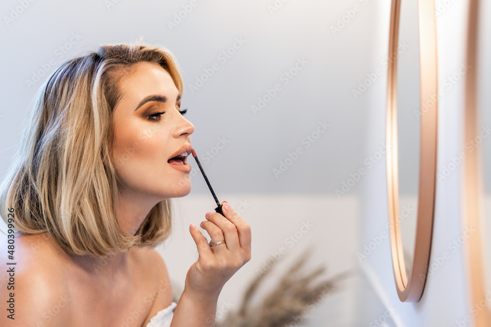 Beautiful lady applying make up in front of mirror in bathroom