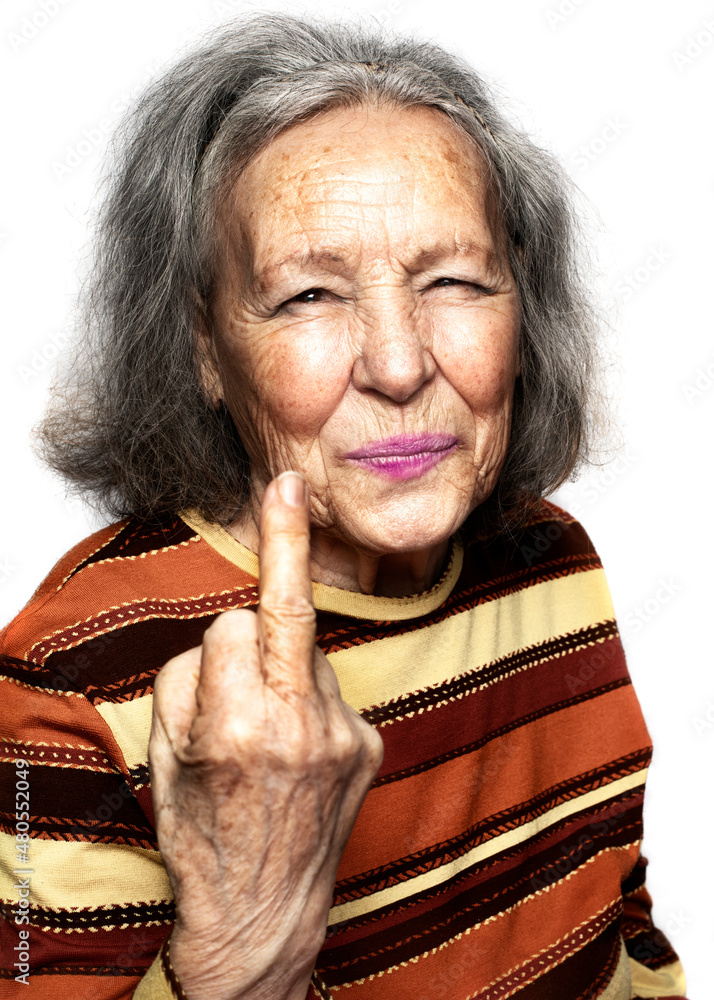 Portrait of elderly woman showing the middle finger making a bad expression, provocation and funny attitude. concept of fuck you
