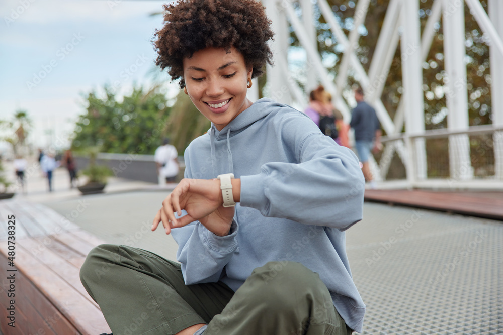 Outdoor shot of happy curly haired woman checks covered distance on smartwatch sits crossed legs against blurred background with people walking wears hoodie and trousers spends weekend at city