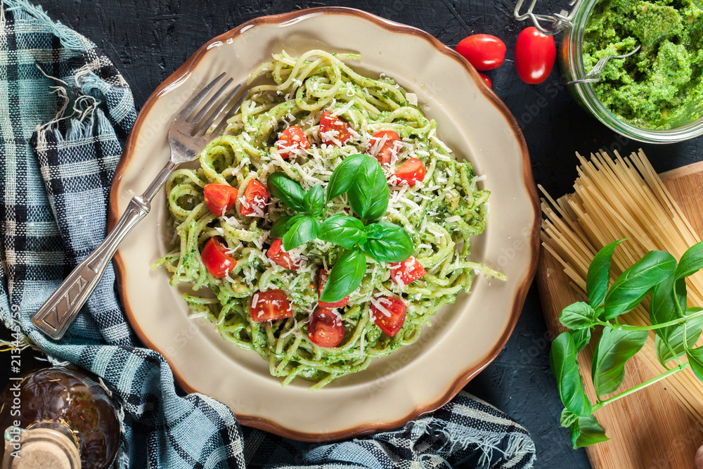 Fusilli pasta with bacon, kale and parmesan cheese. Healthy food