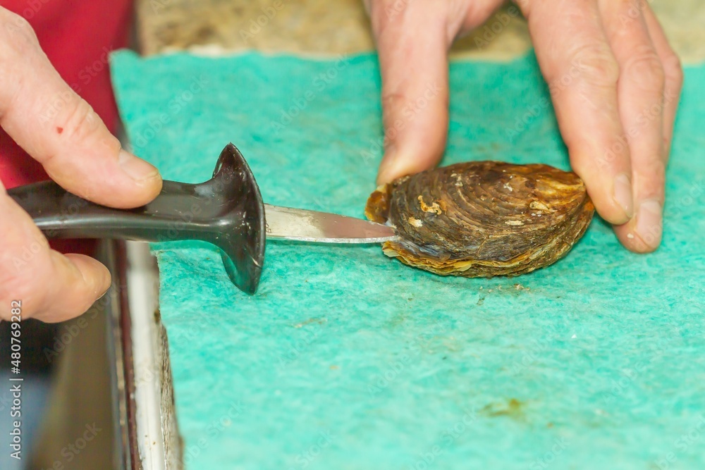 Unrecognizable man opening an oyster with a knife at the stone market in Vigo, Galicia (Spain), selective approach to seafood.