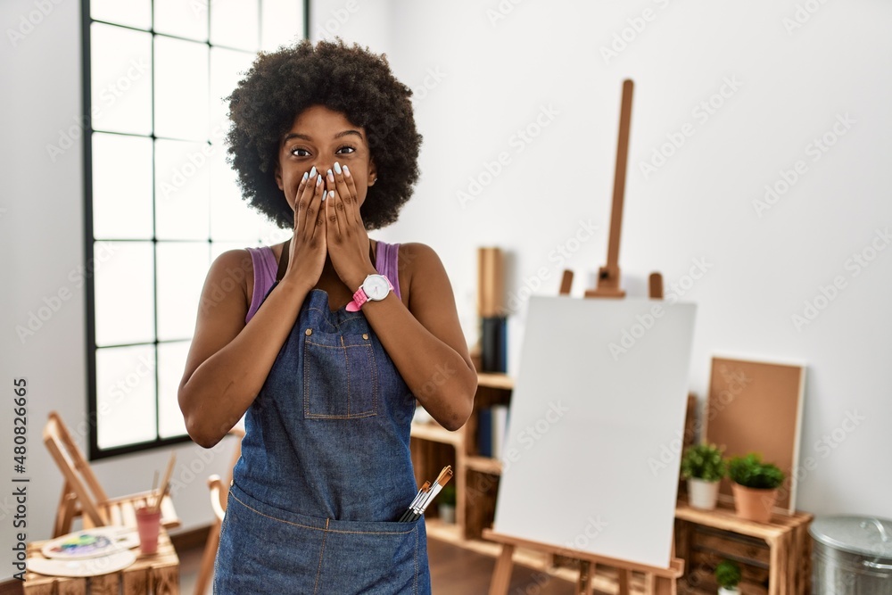 Young african american woman with afro hair at art studio laughing and embarrassed giggle covering mouth with hands, gossip and scandal concept