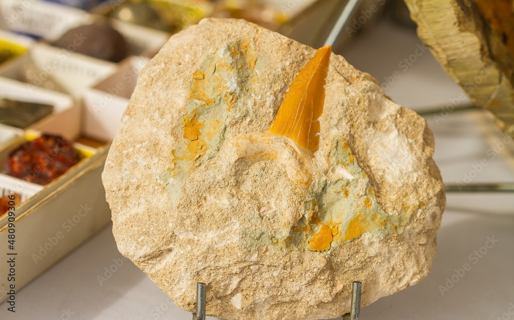 Shark tooth, fossil embedded in the rock.