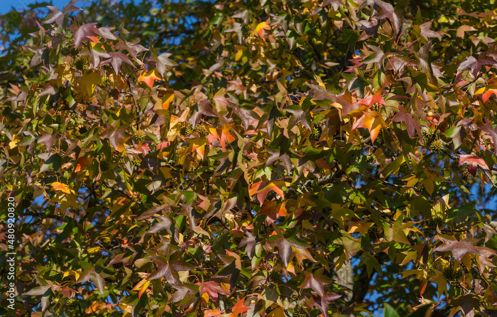 Close-up of red leaves and spiky balls seeds of Liquidambar styraciflua, commonly called American sweetgum (Amber tree) in Goryachiy Klyuch park. Nature concept for design