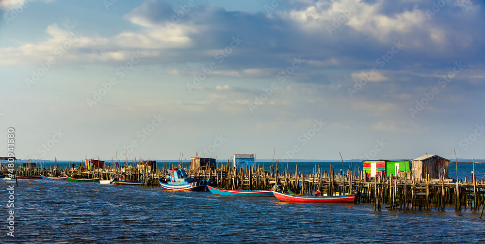 Pier with Colorful Fishing Boats and Sheds at Porto Palafitico, Carrasqueira, Portugal