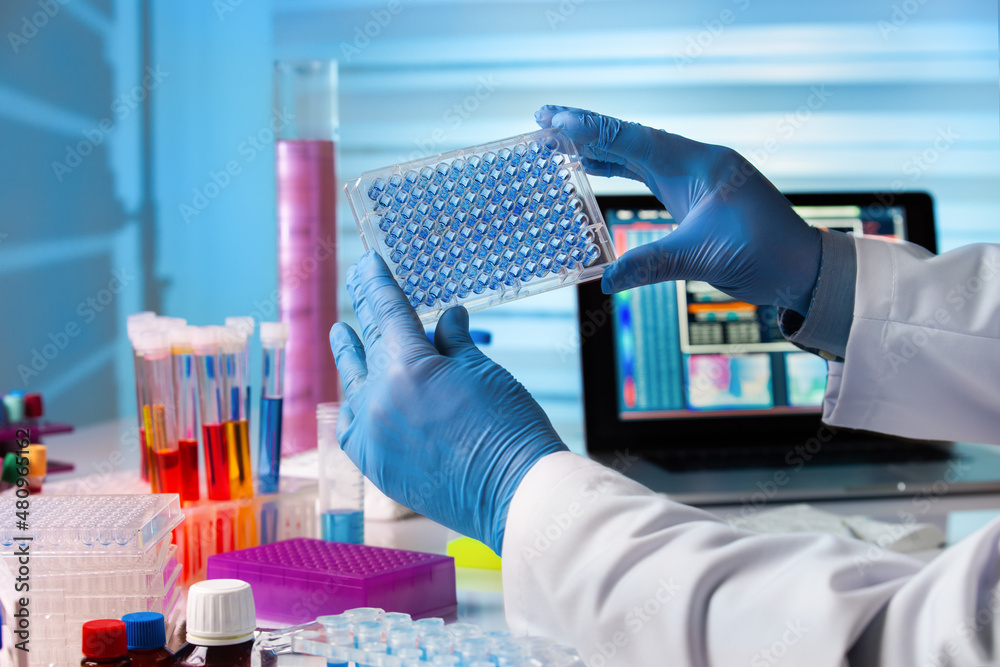 Researcher in lab holding a 96 well plate with biological samples for analysis. Scientist working in laboratory with samples in micro plate