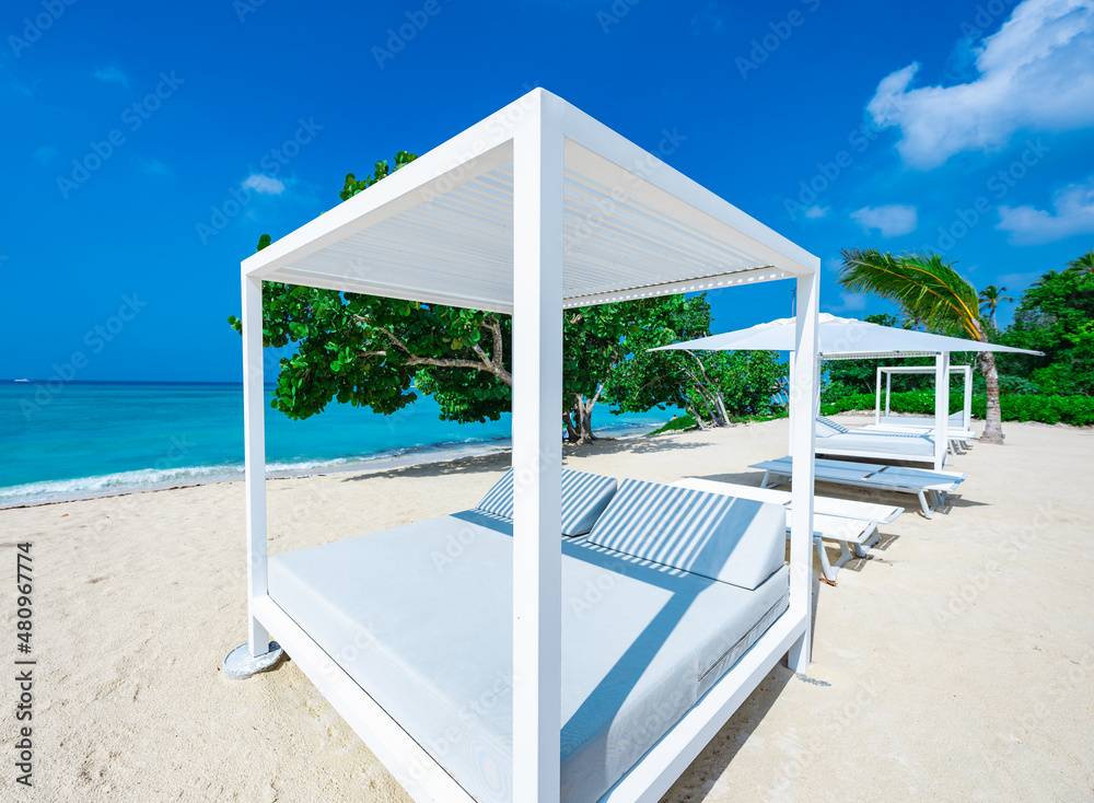 white bed on the sandy beach of the sea