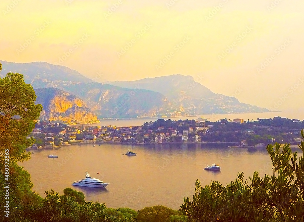 Panoramic view of French Riviera near town of Villefranche-sur-Mer, Menton, Monaco (Monte Carlo), Côte d'Azur, French Riviera, France