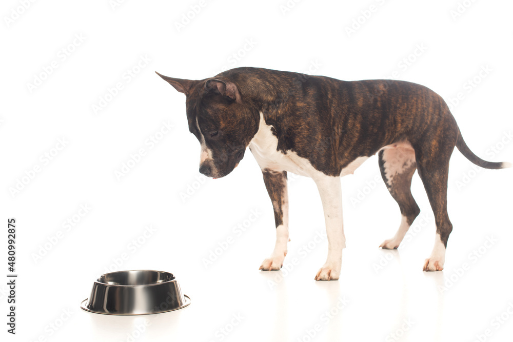 purebred american staffordshire terrier standing near bowl with pet food on white.