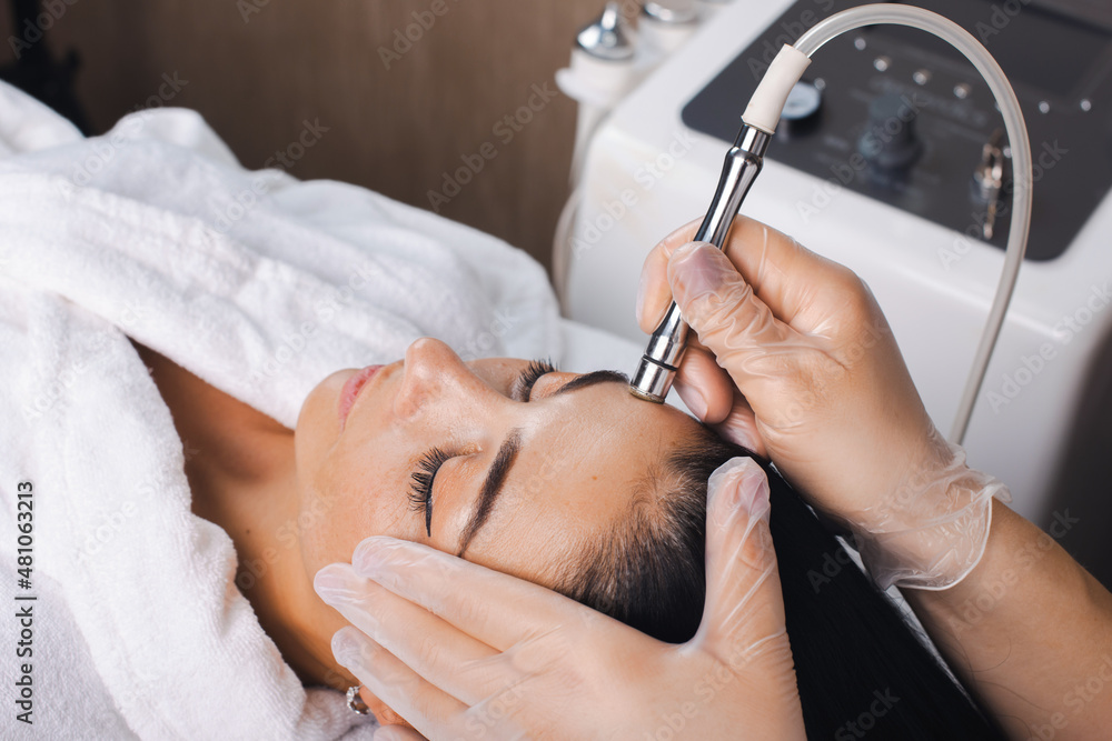 Cosmetologist's hand is making cavitation rejuvenation skin treatment. Facial treatment. Facial skincare. Beauty skin care. Rejuvenation treatment.