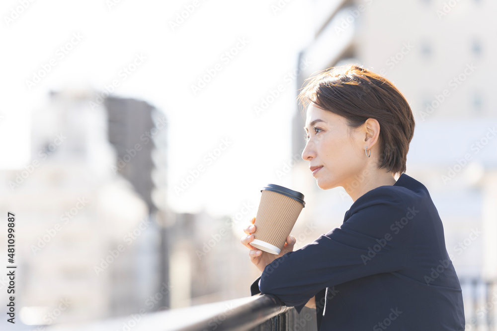屋上でコーヒーを飲んで休憩するビジネスウーマン