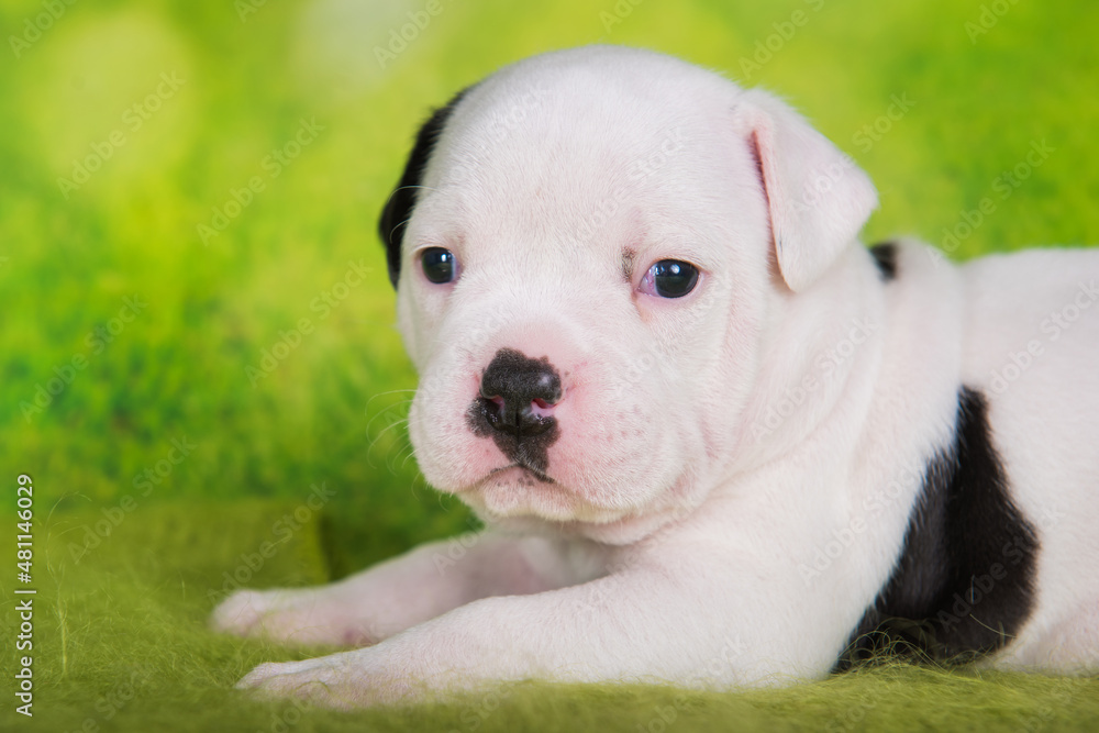 Close up portrait of American Bullies puppy on green background