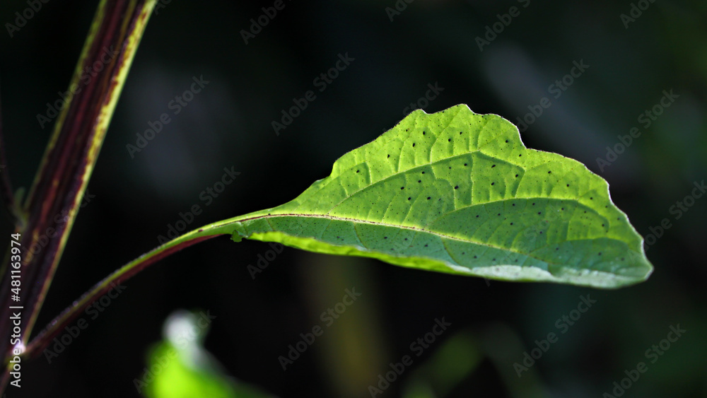 Apple-of-Peru ( Nicandra physalodes ) plant with isolated green leaf and black background