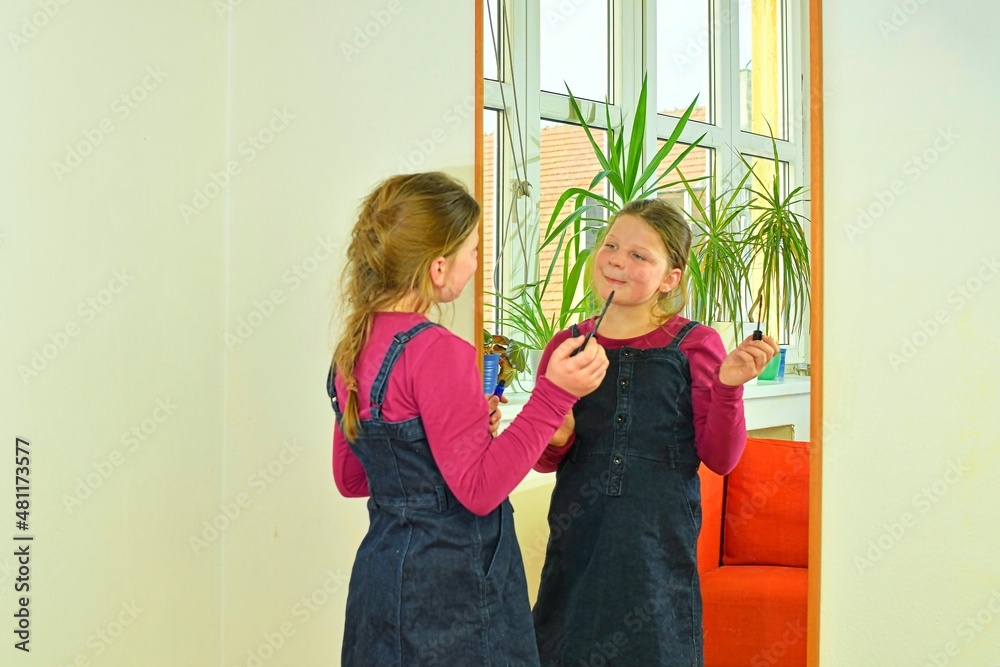 Beauty and fashion concept. Child with nice cheeks smiles and paints lips indoors. Little girl holds lipstick or mascara in front of mirror in the room. Kid tries to paint lips and do makeup with