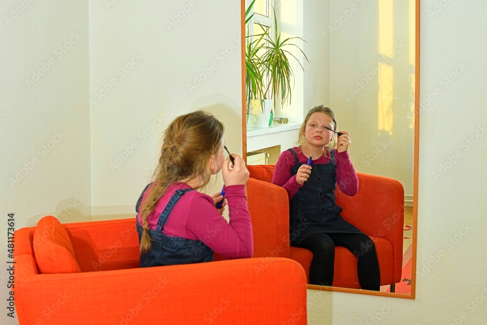 Cheerful little girl applying make-up and looking at her reflection in mirror while sitting in the red armachir