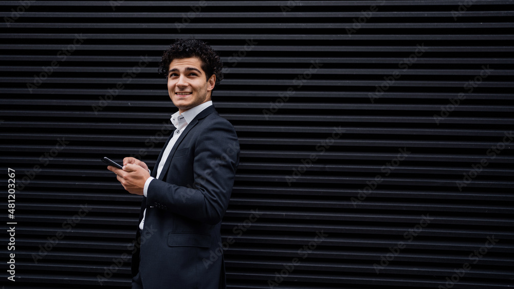 A male manager in an official suit holds a phone in his hands, writes a message to the social network