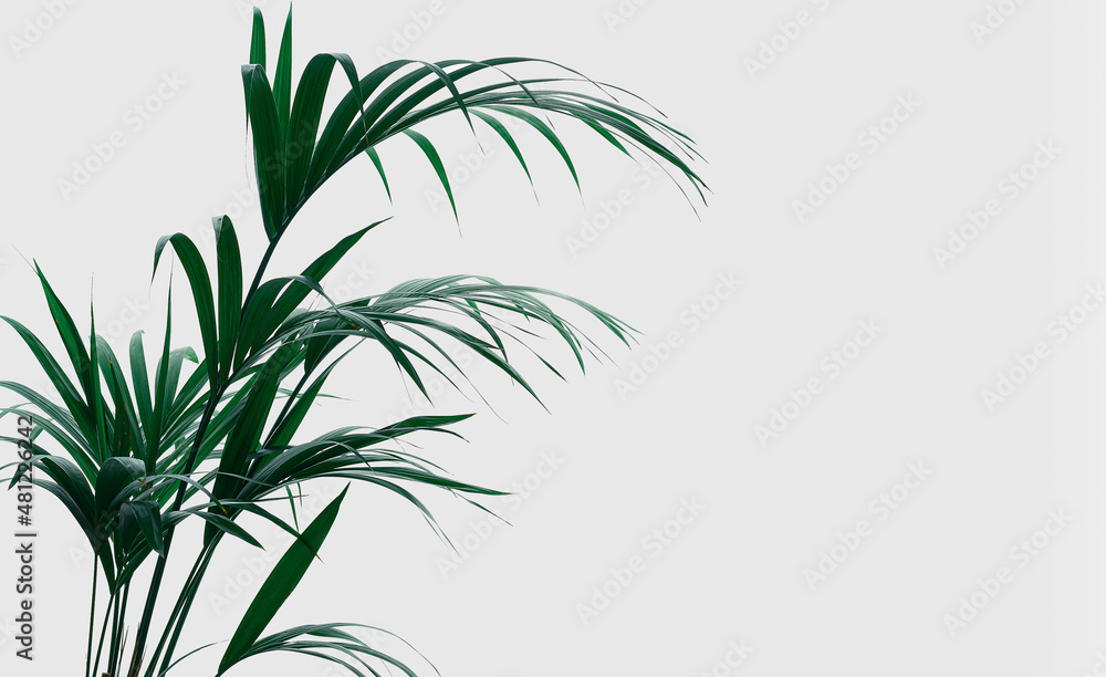 Planta Kentia de color verde intenso . La textura de las hojas tropicales sobre fondo blanco o pared blanca. Ambiente relajante y armonioso.